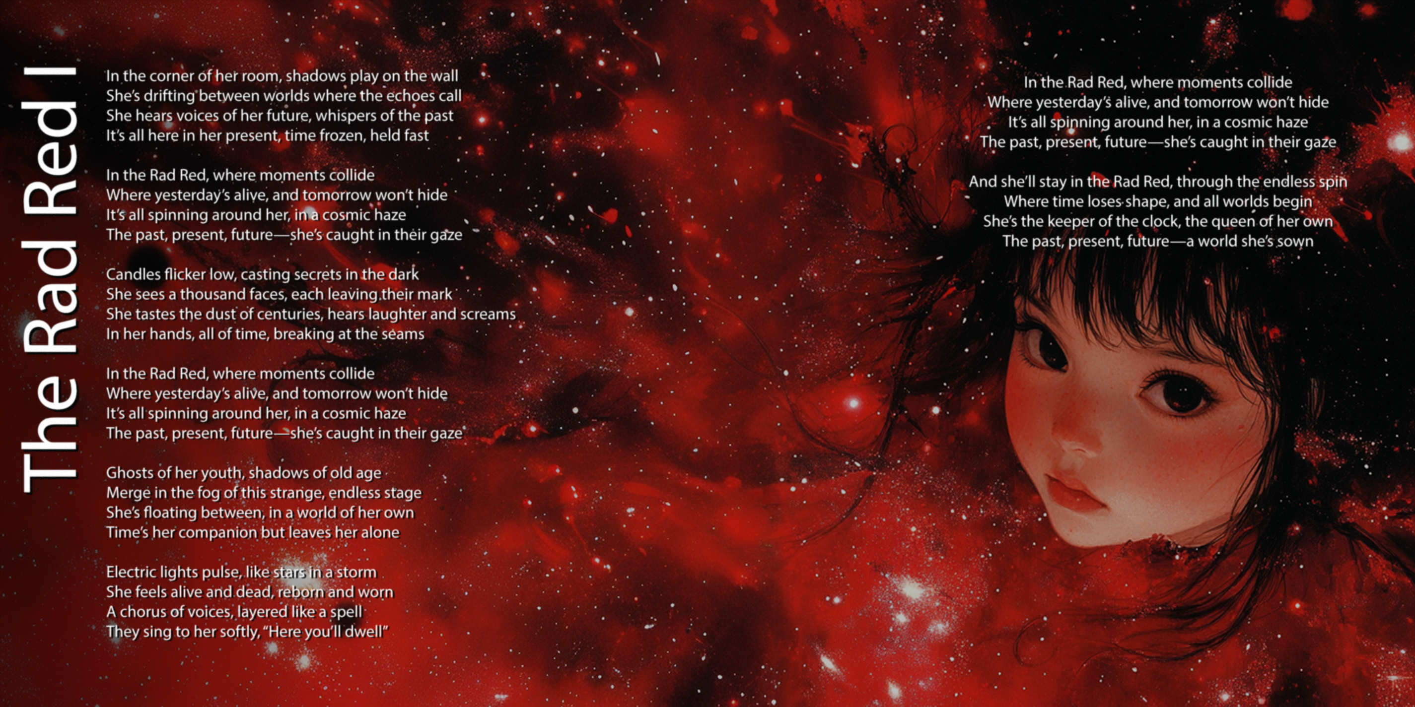 The phrase “Rad Red” suggests a vivid, otherworldly dimension—perhaps a metaphor for a liminal space where time folds upon itself. The protagonist, a young girl, is depicted as both an observer and a participant, caught in an endless cycle of existence. She is surrounded by voices, visions, and spectral remnants of different eras, reinforcing the idea of time as something fluid rather than linear.