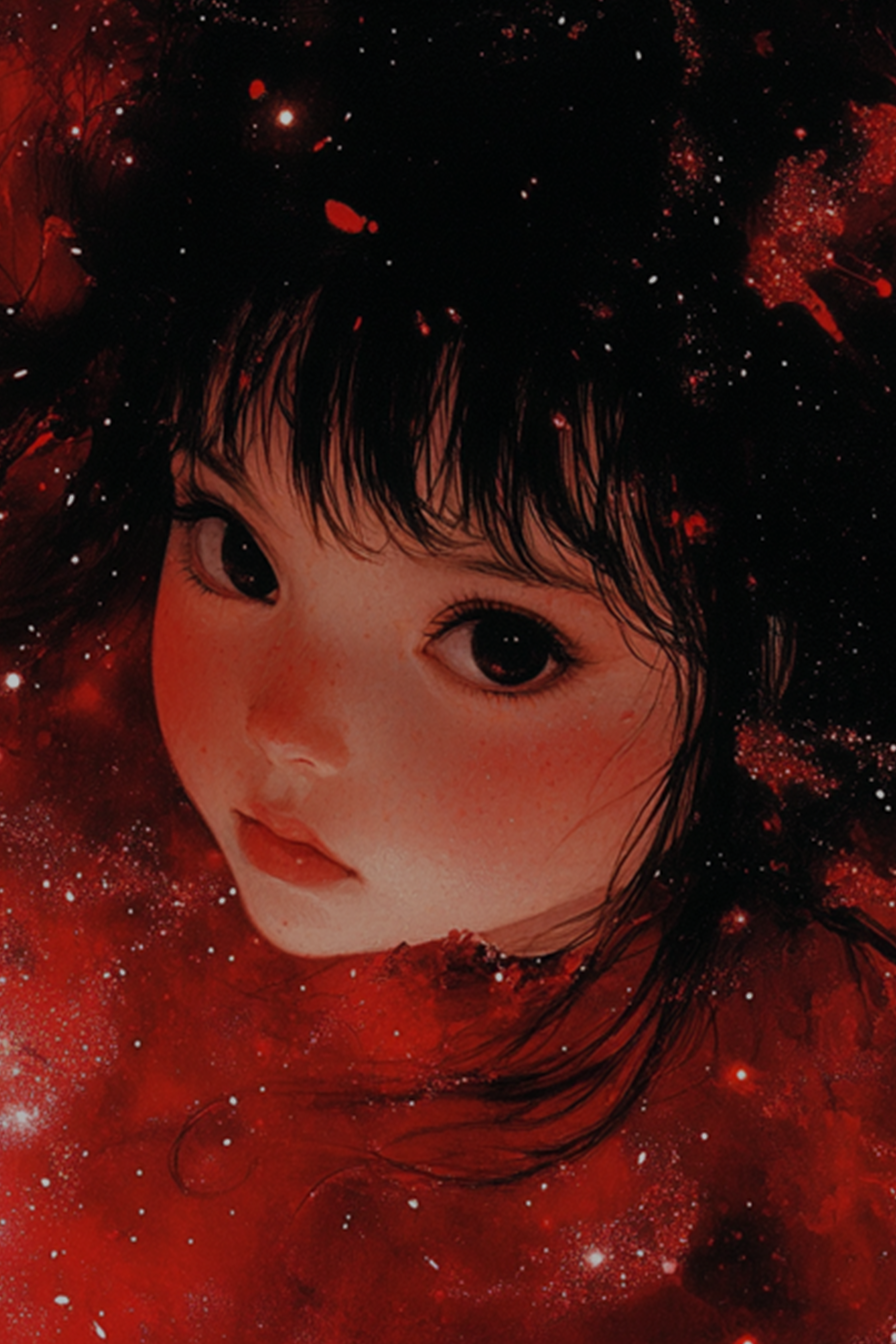 From this cosmic turbulence, the delicate face of a young girl emerges on the right side of the composition. Her skin is porcelain-pale with the faintest blush, lending her an appearance of fragility and innocence. Her dark, oversized eyes shimmer with emotion—somewhere between melancholy, wonder, and silent yearning. Her lips, gently parted and tinged with soft pink, hint at a quiet voice never spoken. Black wisps of hair drift around her face and dissolve into the surrounding nebula, blurring the boundary between her and the cosmic swirl that envelopes her.