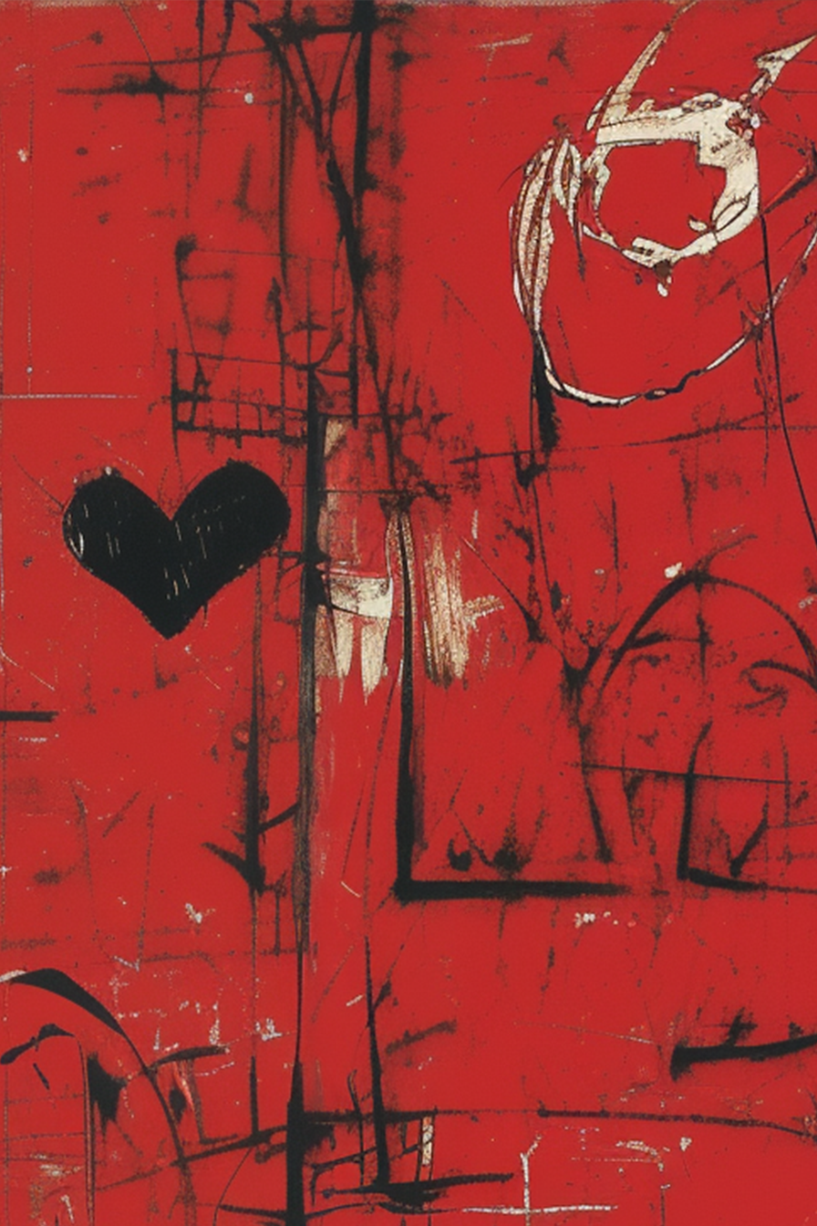 Near the center of the canvas, just slightly left, sits a solitary black heart—simple, solid, and instantly recognizable. Its edges are not pristine; instead, they feel hand-drawn, slightly uneven, as though marked in a moment of desperation or deep feeling. Amid the storm of red and black lines, the heart becomes a focal point—small but significant, a symbol of vulnerability suspended in chaos. Its placement and form suggest it may represent love lost, a fragile soul within disorder, or a quiet voice inside a noisy mind.