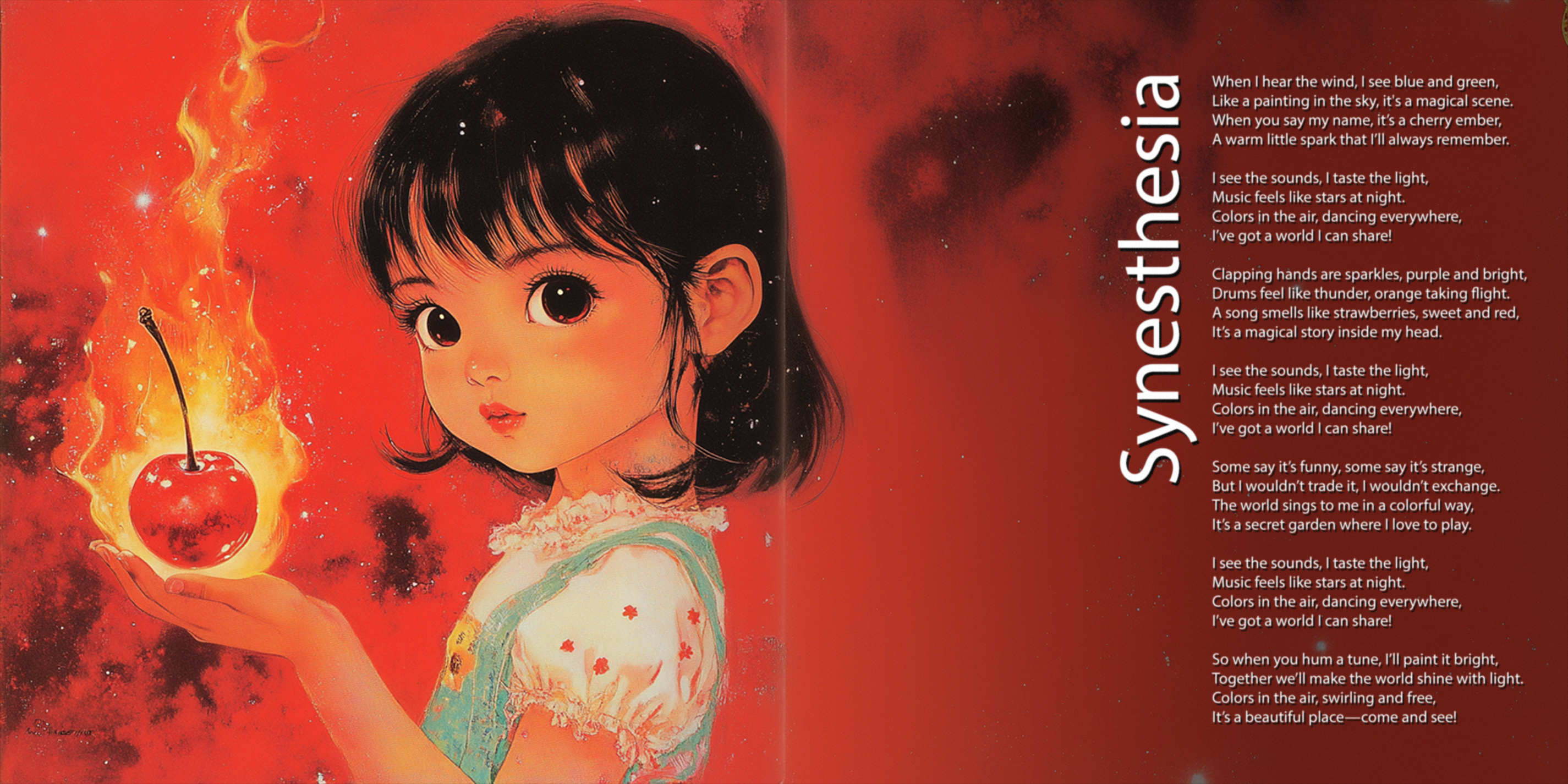 “Synesthesia” (1991) by Cherry Ember is a joyful, kaleidoscopic anthem that captures the wonder of experiencing the world through intertwined senses. Written and performed by Cherry Ember herself—an artist living with synesthesia—the song bursts with playful imagery of tasting light, hearing colors, and feeling music as a tangible, vibrant force. With its dreamy, shimmering melodies and luminous lyrics, Synesthesia invites listeners into her unique, magical perspective, transforming everyday sensations into a celebration of creativity, connection, and joy.