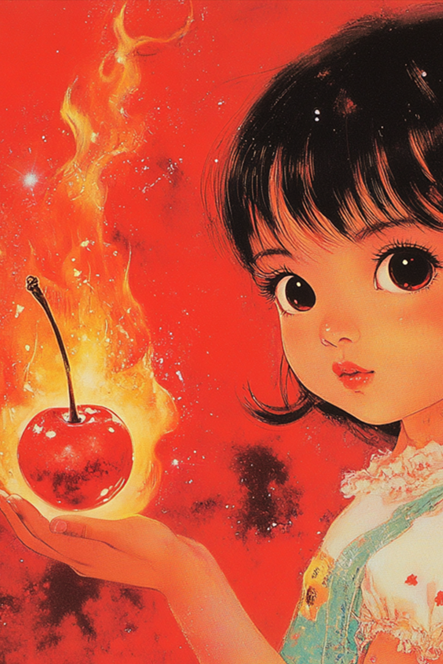 In her small, outstretched hand rests a single, glowing cherry—completely engulfed in flames. The fire dances upward in brilliant hues of yellow, orange, and white, yet the cherry itself remains pristine, untouched by the heat. Its surface gleams under the firelight, polished and bright, and the unburned stem stands rigidly upright, defying the laws of nature. Her fingers are relaxed, unburned, as if she’s either unaffected by the heat or holding something not of this world. The flaming cherry becomes the centerpiece of the image, a magical and ominous object radiating a power that feels both ancient and forbidden.