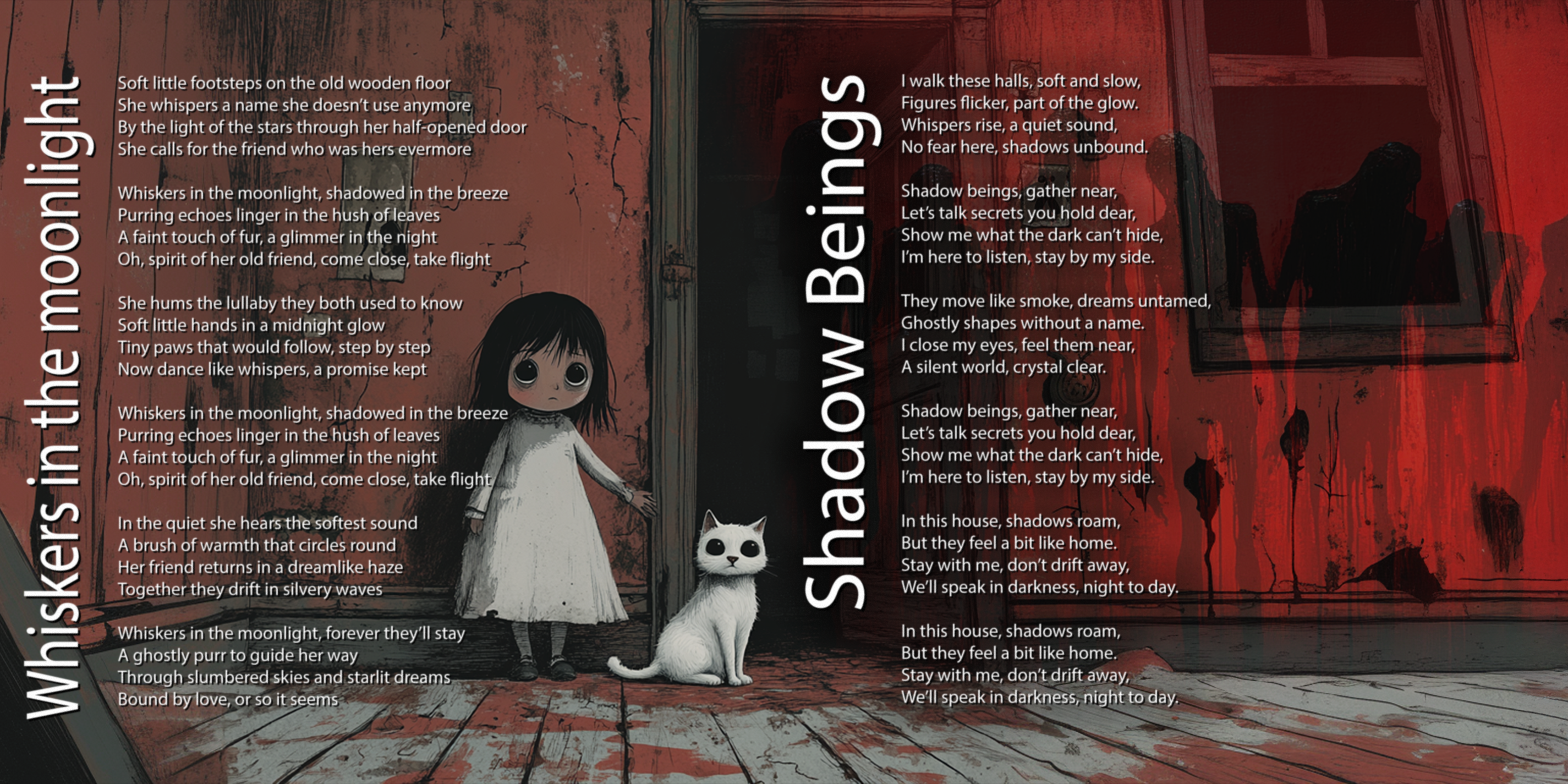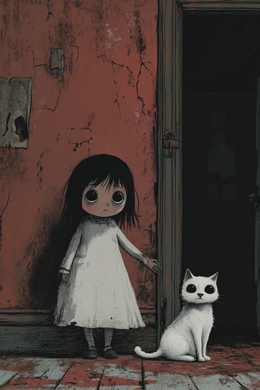 The white cat, with the same wide black eyes as the girl, sits still and alert beside her. It mirrors her in appearance and posture, its pristine fur creating a stark visual contrast with the dark, rotting room. More than just a pet, the cat feels like a familiar—a guardian spirit or silent sentinel that shares the girl’s eerie calm. Together, they form a strange, ghostly pair: untouched by the decay around them, yet seemingly of it.