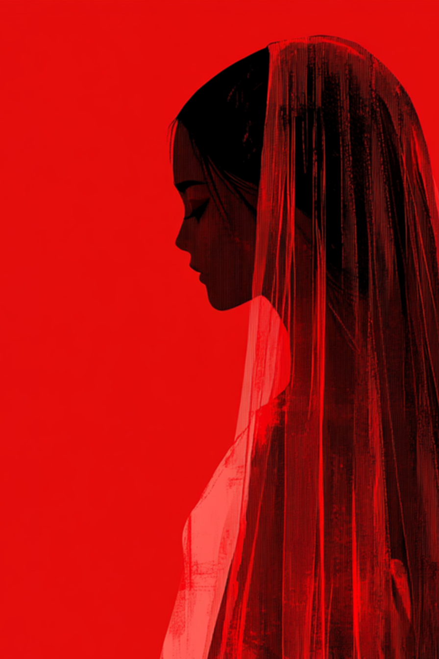 The figure’s presence is delicate and composed. Their long, dark hair is neatly gathered beneath a translucent veil that flows softly down their back, shimmering faintly as it catches the ambient red of the background. The face is rendered with smooth, gentle curves, the downward tilt of the head evoking reverence, contemplation, or mourning. Beneath the veil, a gown or ceremonial robe can just be discerned—its form obscured by shadow and gauze, lending it an ambiguous air that straddles the line between bridal purity and funereal grace.