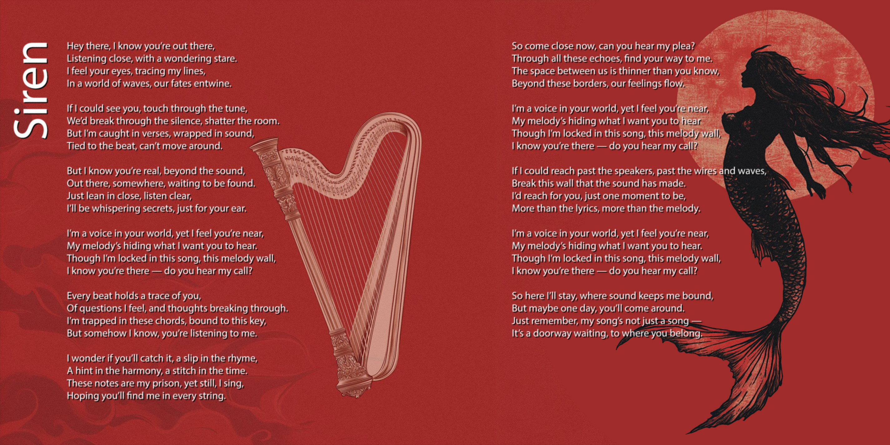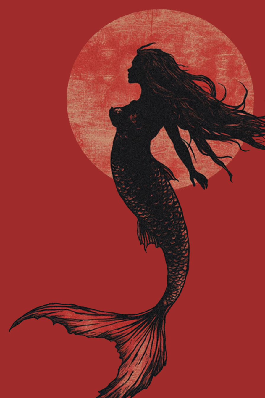 Opposite the harp, on the right side, is the bold black silhouette of a mermaid, poised in graceful solitude. Her long hair streams behind her as if caught in an eternal current. Her form curves elegantly from human to tail, evoking both strength and sadness. Behind her, a massive red moon rises—a textured echo of the backdrop, slightly distinct, suggesting a celestial witness to her existence. She feels like a siren adrift in myth, her song swallowed by the silence of the red void.